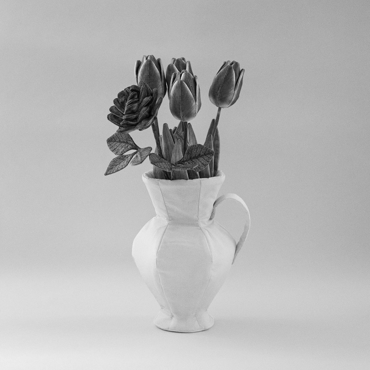 布でできたフラワーベースに布でできたお花3種(チューリップ、ガーベラ、バラ)からお好きな組み合わせで合計5本をお選びいただけます。
